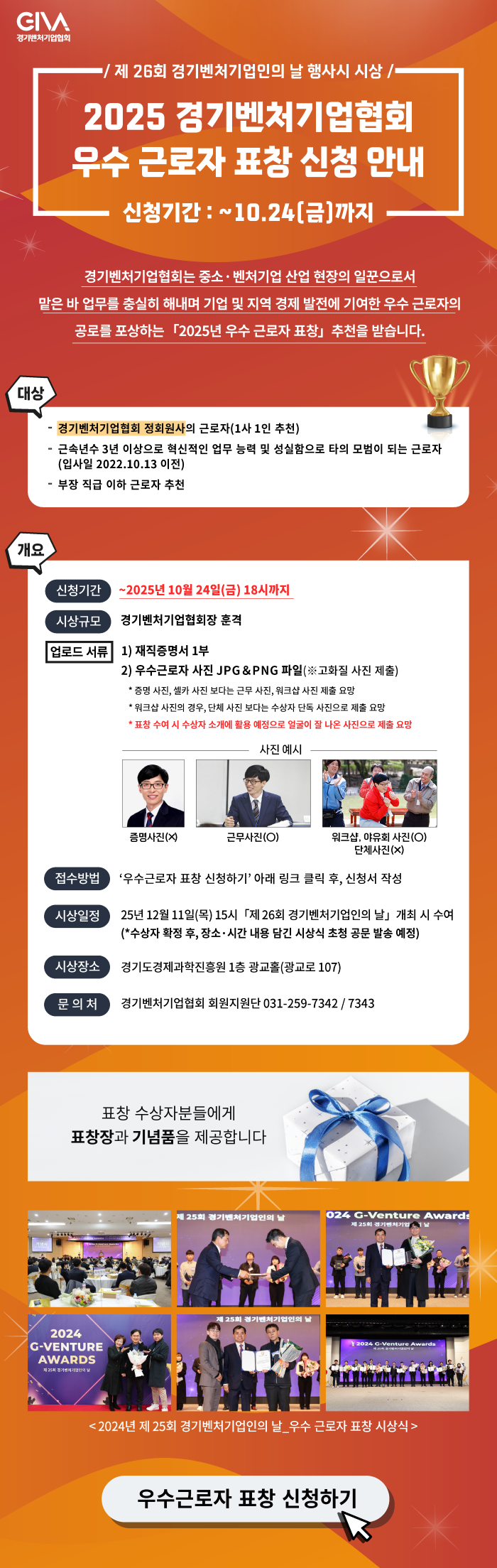 2025년 경기벤처기업협회 우수 근로자 표창 신청 안내(~10.24까지)